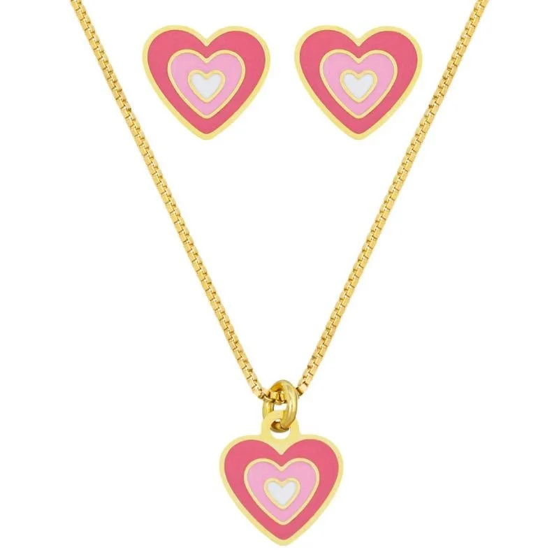 CONJUNTO INFANTIL BRINCO E COLAR CORAÇÃO CRAVEJADO BANHADO A OURO